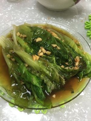 油热下大蒜头, 爆出香味(也可煸炒至金黄)倒入生菜,放入蚝油、盐、糖等调料,大火翻炒后出锅,,,
