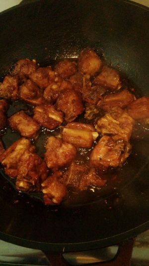 将焯水的肋排走大油,待肋排炸制八层熟,肉看上去有点点焦。