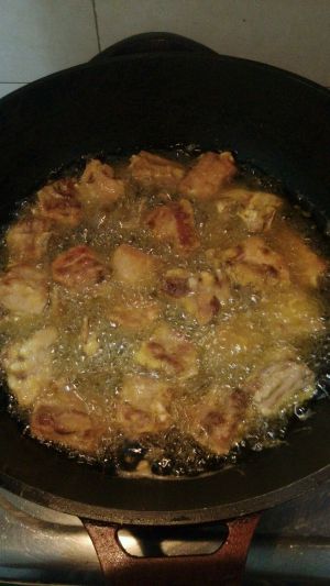 腌制好的排骨放入油锅炸,注意用中火,要给每块排骨翻身,确保每一面都炸至金黄。