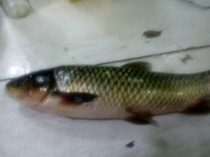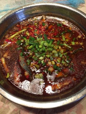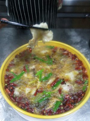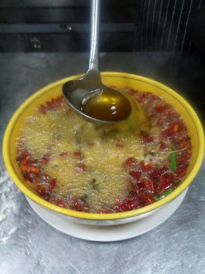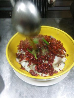 放上辣椒面,小米椒末,蒜末,花椒。另起油锅,油冒青烟后倒入鱼盆中。