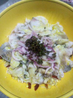 最后吧干辣椒末和花椒,葱花放在装盘后的鱼上,再在锅中放油,等油烧辣后就淋在鱼上,大功告成