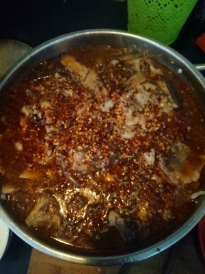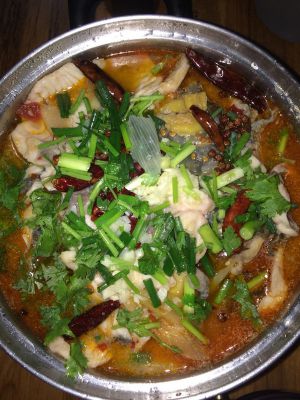 把汤跟鱼片倒入过好水的蔬菜锅里,把剩余的蒜茸,香菜,小葱放上面。炒锅洗净后烧热下油,放入花椒,,干辣椒炒香后淋在上面即可。