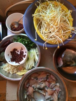 1:所有食材准备好,洗净后,大葱切好,蒜蓉剁碎稍微准备多点,姜切丝,鱼处理好后鱼头和鱼骨放一起,鱼肉切片用生粉,蛋清,盐,胡椒粉腌制20分钟 2:锅烧开水把蔬菜类的过水后放在容量较大的盆。 3:炒锅加油烧热后下,姜,蒜,大葱,辣椒,香叶,还有豆瓣酱,炒香出红油,捞起备用。锅里在放少许油,把鱼头鱼骨煎一下,下水。把所有调料下去一起熬成汤,放适量盐和鸡精调味。然后把腌过的鱼片轻轻倒入汤里,用筷子轻轻拨开。变色后关火。