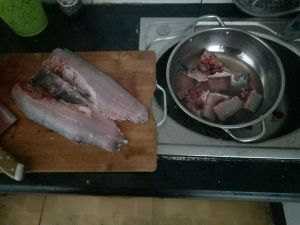 水煮鱼料包里的酱料包炒香,放汤,鱼骨,鱼头放入炖一开,下鱼肉片。