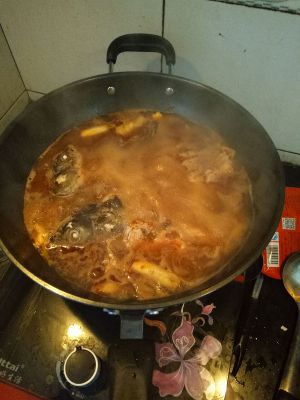 将鱼头和鱼骨放入炒匀。加入酱油、料酒、糖、加入刚才煮鱼头的汤,没过鱼肉。