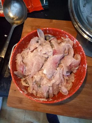 鱼片加适量盐腌制,(有白酒或者料酒也可以加点)淀粉和蛋清抓一下鱼片,放入刚才烫菜的酸菜汤里烫熟,然后整锅倒入刚才垫底的菜里。切片柠檬和小米辣备用。