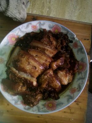 五花肉块凉透表面干了, 抹蜂蜜或老抽到67成热的油锅里去炸, 盖上锅盖子, 以防工伤啊! 这样最后成品是虎皮状态。 再取出凉透,切成薄厚一样的厚度, 把皮朝下放一个盆或大碗里; 加葱姜片, 生抽2老抽1的比例; 加冰糖少许;最后平铺盖上梅干菜…… 上蒸笼大火蒸50分钟左右。