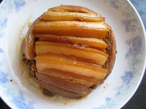 再将炒好的梅干菜放在肉片上,放在锅里,隔水蒸40-50分钟。蒸好以后找一个盘子,将扣肉倒扣在盘子里即可。