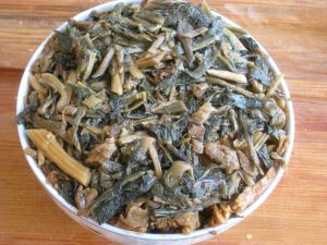 锅底少许油,加入姜末翻炒梅干菜,快炒好的时候放1勺煮肉的汤和1勺盐翻炒均匀即可出锅。