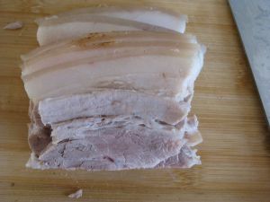 将煎过的五花肉切片,每片约长8厘米、宽4厘米、厚0.5厘米。