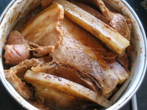 猪五花肉切成长15---20厘米,宽10厘米左右的大块,刮净肉皮毛茬。