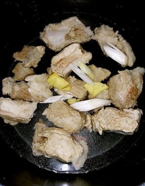 排骨冷水冲洗干净,冷水下锅,放葱,姜片煮开撇去浮沫。煮一个小时
