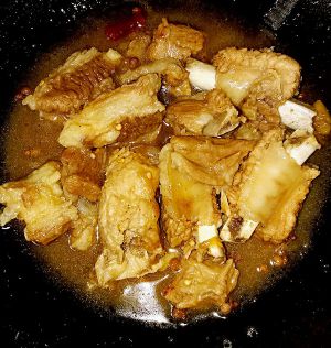 倒入料酒、生抽(因为不放盐,所以生抽要稍微多点)、一丁点香醋(可以让排骨的钙保持)、冰糖适量。