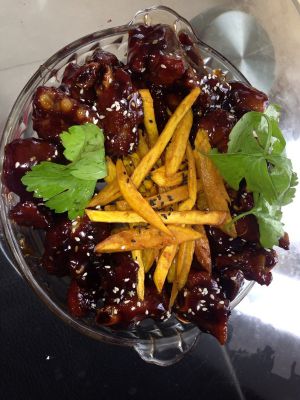 待汁收干后,洒上香芝麻,装盘后放些红薯条即可!