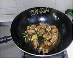 热锅,放少量油,切好姜蒜放入炸香,把排骨放入锅中,翻炒一小会儿,把事先调好的酱汁倒进去,翻炒。