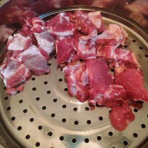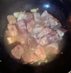 排骨砍小段,冲水洗净,加料酒,老抽,盐腌1个小时。