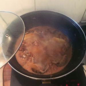 倒入煎好的排骨,倒入汁,再加点番茄酱,中火翻炒,用小火炖约40分钟