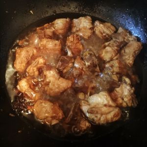 排骨烧之七成熟时加入糖醋汁继续焖煮。