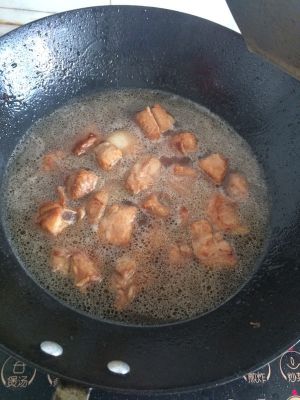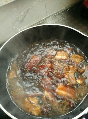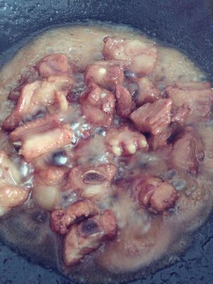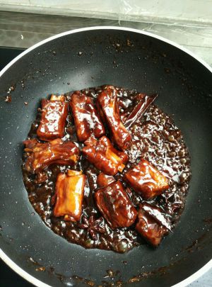 锅内放少许油,加白糖直至白糖炒化,放入排骨炒至排骨变色,加水(水没过排骨即可)
