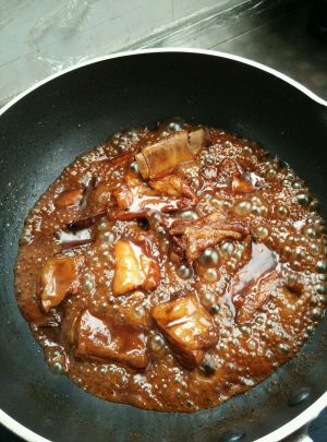 调至中火,带到收汁差不多的时候打开锅盖翻炒,最后根据个人口味尝一下,喜好甜的可适当再放些醋和糖