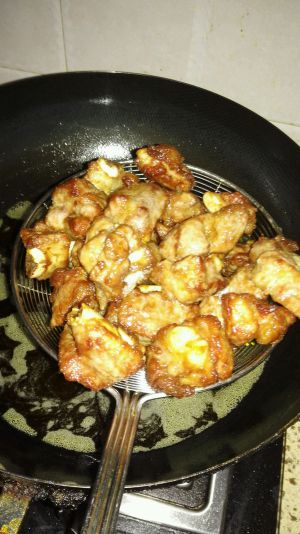 腌好后放入适量生粉,如7成热的油锅炸熟排骨,起锅沥油