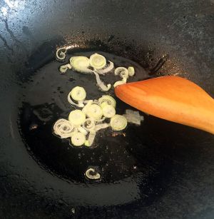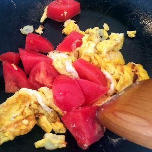 第三步:锅里先放食用油适量,再把葱和鸡蛋放进去翻炒,炒完后放在一旁备用,再把西红柿放入锅中翻炒出汁再把鸡蛋放入其中,放入适量白糖,一小段时间后出锅。