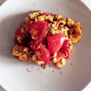 西红柿用热水去皮,切成厚片备用。锅烧干加油烧热,加入西红柿翻炒,翻炒两遍后加入鸡蛋继续翻炒两遍加入适量水中火闷3分钟,加入盐、鸡精装盘出锅。