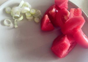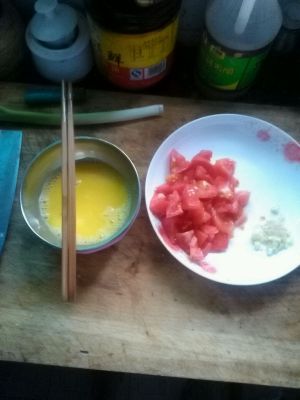 第二步:鸡蛋打碎放盐,西红柿切小块,葱切适量碎块。