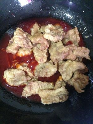 锅中放少于油,油稍热时,放冰糖熬开,待糖汁起沫放入切碎的番茄,熬制番茄酱,熬制稠状把蒜末和炸好的肉片放入当中翻炒,加入备用的胡萝卜,洋葱,翻炒均匀,再事先勾半碗淀粉水,倒去!收汁完成!!