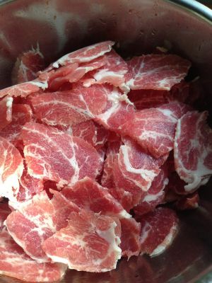 肉切片后,放点调料,鸡精,盐少于生抽(酱油),少于料酒,一个鸡蛋,腌制