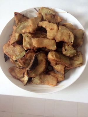 包裹好面糊的茄子,入锅炸至金黄捞出备用