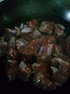 锅烧热放油加入焯水后的排骨大火翻炒大概1分钟 加水(没过排骨) 姜