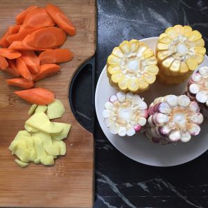 玉米切一块一块的,胡萝卜切滚刀块,姜切片