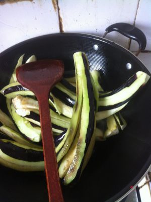 茄子从淡盐水中捞出沥干,放入锅中,翻炒