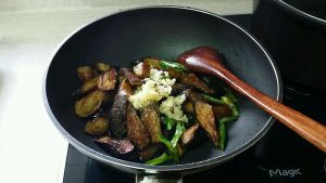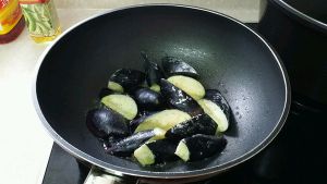 锅内留少许油,翻炒葱蒜丁,香味溢出后,放入茄子翻炒,再放入备好的调汁。