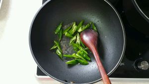 茄子切好,用淡盐水浸泡半小时,捞出拿干净的不把水捏干,用锅烧油,五分热倒入茄子炸软捞出,锅留油放入葱和青椒爆香