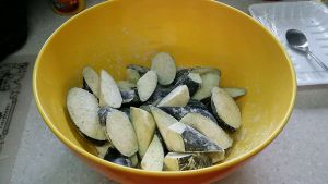 5个茄子洗后擦干水份切滚刀,装盆里抓2小把面粉,颠盆让面粉均匀粘上面粉
