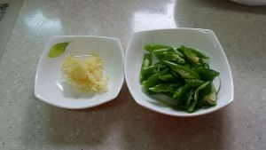 在腌制期间,把所需要的材料都准备好。姜切丝,蒜拍碎,大青椒斜切,大葱切丝,再放几颗花椒。