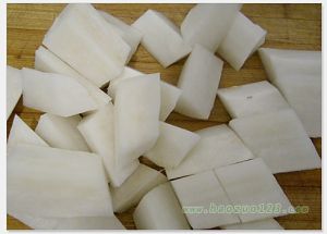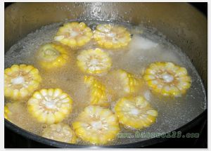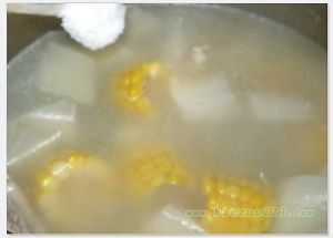 然后再倒入待用的萝卜和玉米块加入少许食醋,大火烧开后转小火烧30分钟。(在炖骨头汤时,加少许食醋,骨头汤中的钙质更容易溢出,有利于人体对钙的吸收和利用。)