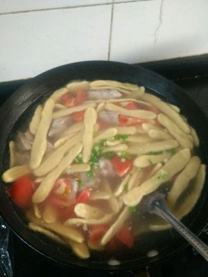 排骨下锅煮开,放番茄,撒葱花,加点点盐,加点点香油。放些面疙瘩就是番茄排骨面疙瘩汤。