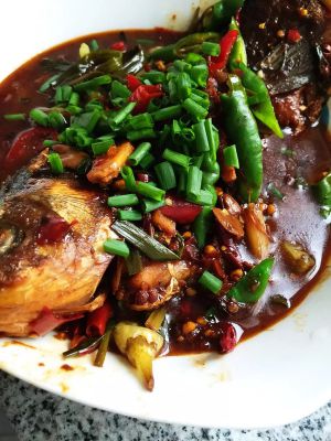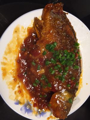 再起锅放入少许油,放入姜、葱段,干红椒炒、盐、鸡精,把炸好的鱼放进锅里,放入少许的老抽和料酒,再加水煮(水不宜太少,漫过鱼肚即可);