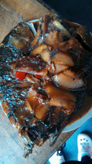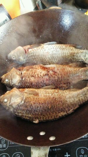 加入葱 姜 辣椒 八角 盐 酒 白糖 醋 酱油 倒如刚好末过鱼的开水(水要适当) 转中小火 盖锅盖煮10分钟左右 出锅装盘 放上大蒜 就OK了