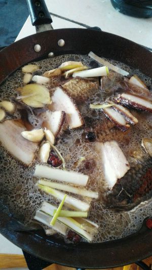 避免鱼入锅时一个调料一个调料的放来不及,就提前兑一碗料汁,姜片,蒜,老抽,生抽,盐,耗油,醋,放碗里,加半碗水,备用