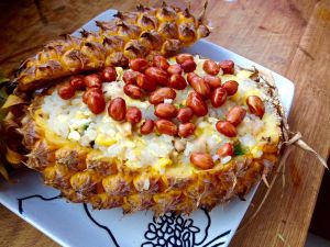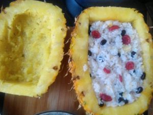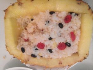 提前把泡好的糯米和所有的米,豆类用电饭煲煮熟(和做米饭一样),放入菠萝内,在米饭上撒一些蔓越莓,菠萝肉和菠萝汁,漂亮!