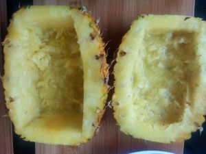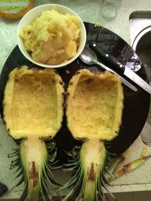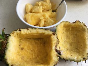 之前还有一步,烤箱180度,15分钟烤菠萝碗和盖子,主要是烤干水份!