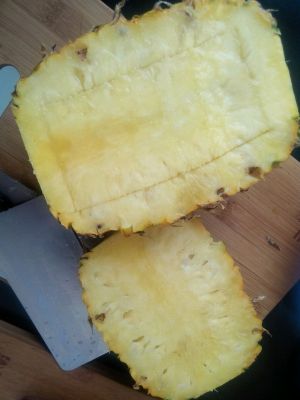 把菠萝或者凤梨切开一个盖,掏出果肉,一会当容器用,黑色部分已经有点坏了,不过还好不影响使用。