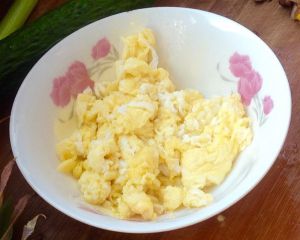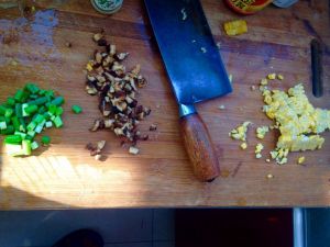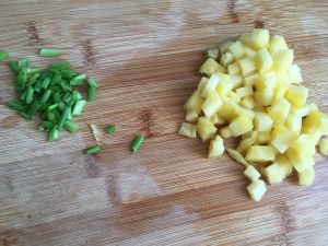 分别把各种辅料切成小丁,鸡蛋炒好用锅铲同样切成丁。