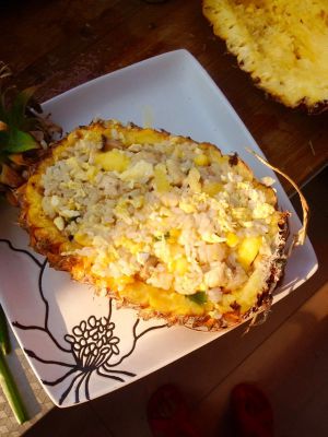 锅内倒入适量油,放入香菇炒一会,放入米饭炒散,再放入鸡蛋,鸡肉,虾仁,玉米,菠萝肉,最后出锅放入葱,把饭乘入菠萝内,稍微压实