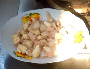 鸡肉切小块,虾仁去虾线,炒熟备用