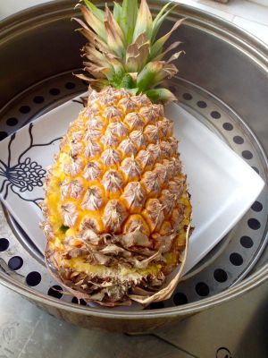 把菠萝盖上,蒸锅里加水,烧开后,放入菠萝蒸10分钟